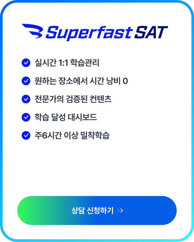 Superfast 선생님들은 학생들이 어디서 어려움을 겪는지 정말 잘 이해하고 계셨어요. 맞춤형 커리큘럼 덕분에 제가 부족했던 부분을 빠르게 보완할 수 있었고, 주말반 수업 덕분에 학교 생활과 SAT 준비를 동시에 해낼 수 있었습니다. 특히 실시간 질문 시스템 덕분에 어려운 문제를 바로 해결할 수 있어서 성적이 빠르게 올랐습니다. 목표했던 점수를 달성할 수 있어 정말 만족합니다.