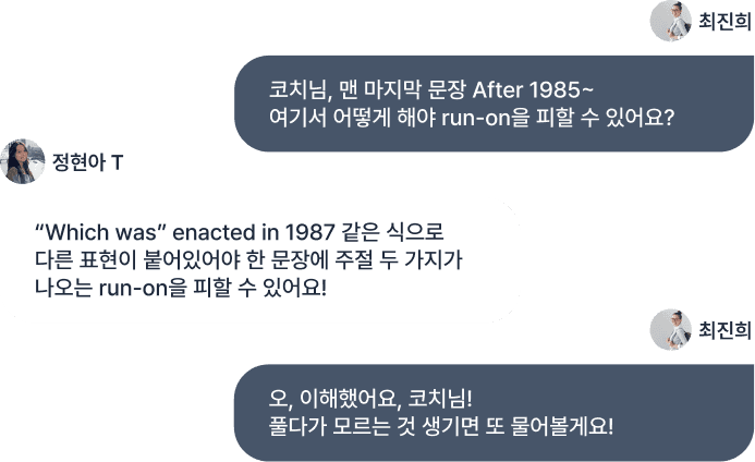 RW 고득점에 특화된 프로그램 덕분에 제가 어려웠던 부분을 집중적으로 공부할 수 있었고, 주말반 수업 덕분에 학교 공부와도 충돌하지 않고 준비를 차분히 할 수 있었습니다. 매일 받은 피드백 덕분에 약점도 빠르게 보완할 수 있었고, 시험 대비가 확실히 쉬워졌습니다. 덕분에 목표했던 점수를 받을 수 있었습니다! 감사합니다.